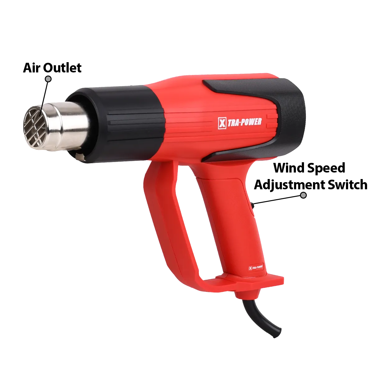 XPT-523 Heat Gun by Xtra Power is a high-performance tool designed for precision and versatility. With a rated power input of 2000 watts, this heat gun offers two adjustable temperature settings: 80-350°C on the first step and 80-600°C on the second step, allowing you to tackle a wide range of tasks with ease. The airflow can also be adjusted, with 300 L/M on the first setting and 500 L/M on the second, ensuring optimal performance for various applications. Additionally, the XPT-523 comes with four nozzles, enhancing its functionality and making it an essential tool for professionals. Experience the superior quality and reliability of Xtra Power with the XPT-523 Heat Gun.