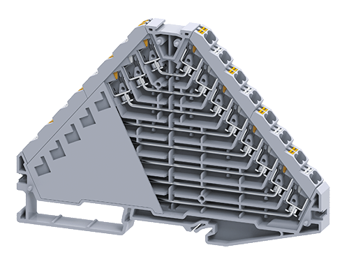 8 level marshelling internally shorted Terminal Block. The space saving method for potential and signal distribution. The push in technology for easy wiring connection i.e. the stripped wire is simply inserted into the terminal point.