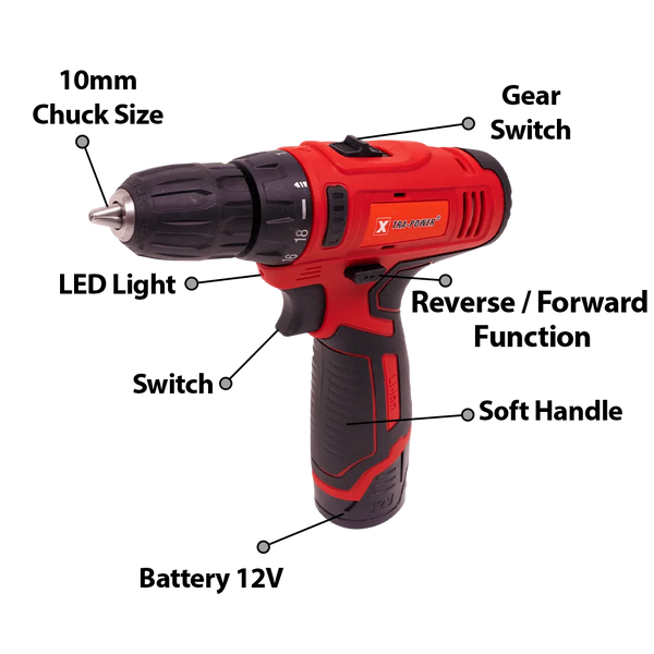 Want an easy-to-use compact cordless drill for industrial tasks? XTRA-POWER XPT 482 with a diameter of 10 mm for the screw. The cordless drill has a firm grasp on the body and accompanies a security lock. It empowers a load-free speed of 400-1350 RPM for consistent and brisk quality tasks. The incredible motor with an energy contribution of 12 volts delivers the errands successfully. The cordless drill is ideal for different tasks and materials as it very well may be utilized for placing openings in the divider, wood, or other intense surfaces. It also provides a reverse and forward function. They can likewise be used for fixing screws and driving fasteners onto surfaces.