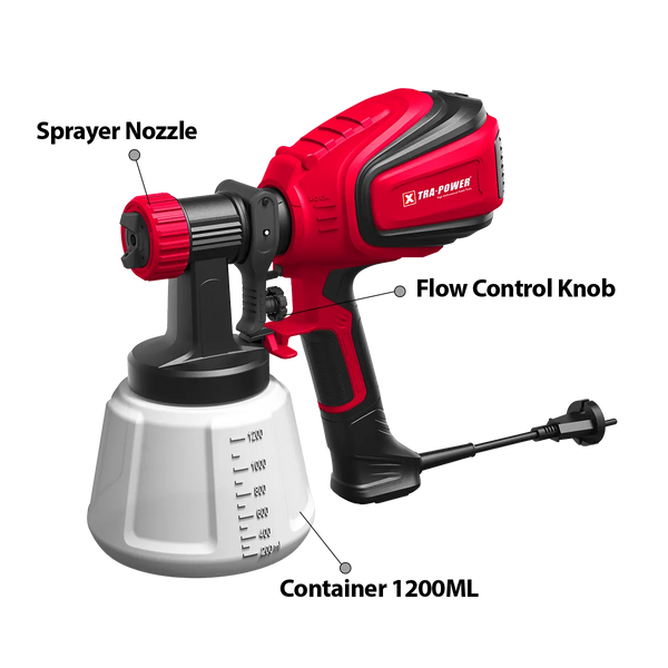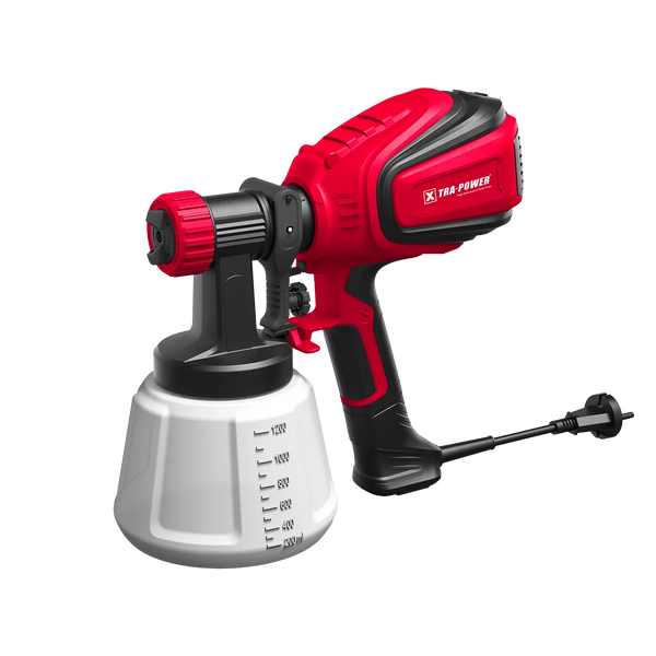 XPT-521 Electric Spray Gun from Xtra Power, a versatile and efficient tool designed for high-quality painting. With a powerful 700W motor, it handles up to 120 Din-seconds of viscosity, ensuring smooth and consistent application. The 1.2-litre tank capacity and 1.2L/min paint flow rate allow for extended use without frequent refills. Featuring High Volume Low Pressure (HVLP) technology, it offers excellent paint atomization and adjustable painting patterns and flow rates. Equipped with three different diameter nozzles, the XPT-521 adapts to various painting needs, making it an ideal choice for both professional and DIY projects.