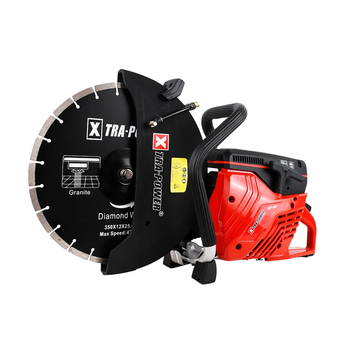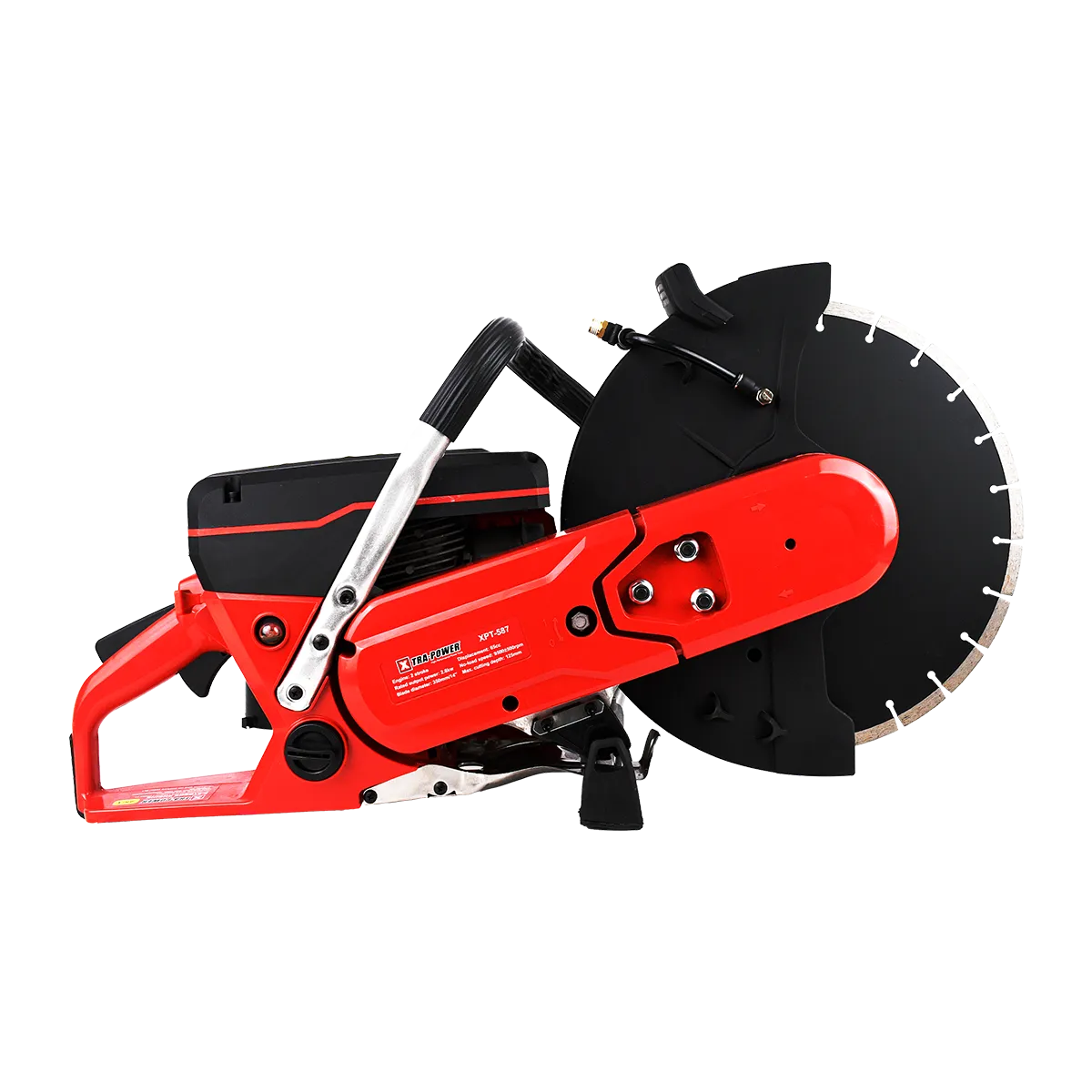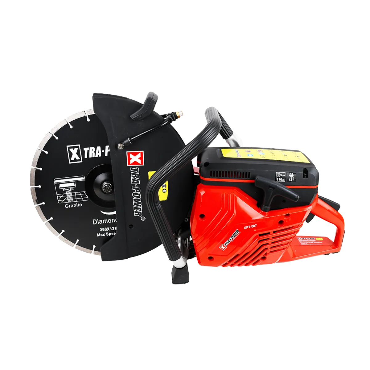 Xtra Power XPT 587 Concrete Cutter is designed for professional and demanding construction tasks. This indispensable tool cuts through concrete, brick, asphalt, and other solid materials. A Tough 2.8 kW engine and 65 CC displacement offer a potent combination of speed and precision. The generous 750 mL fuel tank reduces the need for frequent refuelling, while the maximum speed of 9500±500 RPM ensures quick and accurate cuts. Compatible with a 350 MM (14'') blade, it provides deep and clean cuts, perfect for thick materials and large surfaces. This concrete cutter is made with high-quality materials to withstand heavy-duty use and harsh conditions. It features ergonomic handles and vibration-reduction technology for increased comfort and reduced fatigue. The high-speed performance and blade compatibility offer unparalleled precision, making it suitable for a wide range of applications. Simple maintenance ensures optimal condition, reducing downtime and prolonging lifespan. This concrete cutter is your go-to tool for reliability, precision, and power, equipping you with a tool that stands up to the challenge and delivers exceptional results.