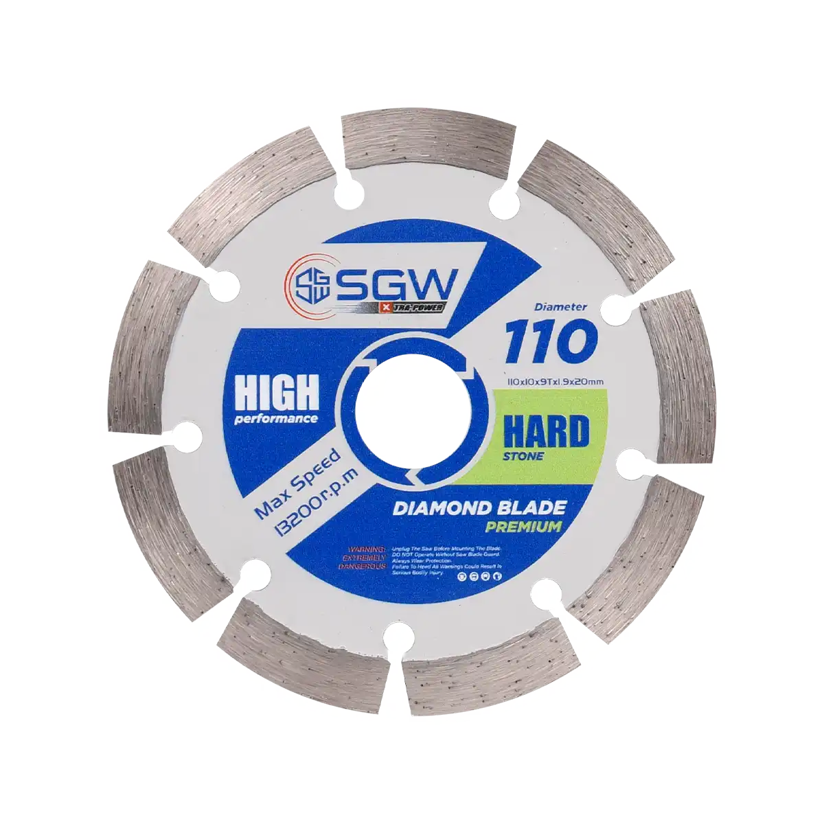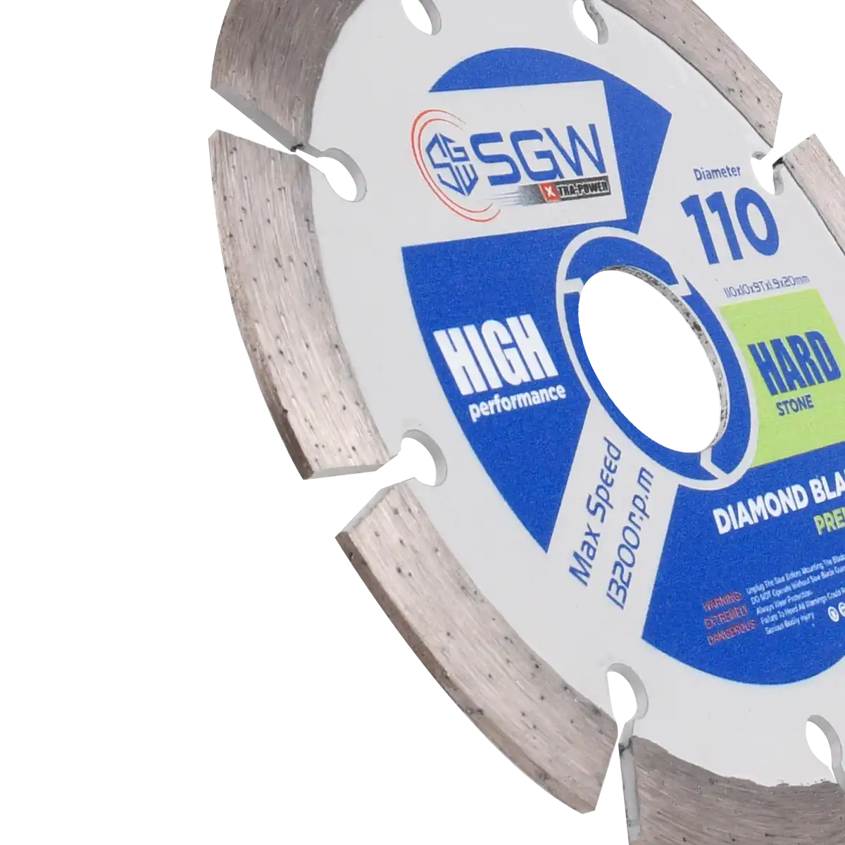 The SGW HARD STONE Diamond Saw Blade is a cutting-edge tool engineered to excel in precision and durability when tackling the toughest hard stone materials. These diamonds saw blade are known for their exceptional hardness and ability to withstand the most demanding cutting tasks.The 10-segment design ensures a consistent and smooth cutting performance. Each segment is strategically positioned to optimize cutting efficiency and minimize wear and tear.The blade's steel core is engineered to withstand the rigors of heavy-duty cutting. It provides stability and precision, ensuring that your cuts are accurate and clean. The 110mm, 20.00mm, 10-segment blade is also highly effective in cutting through concrete.