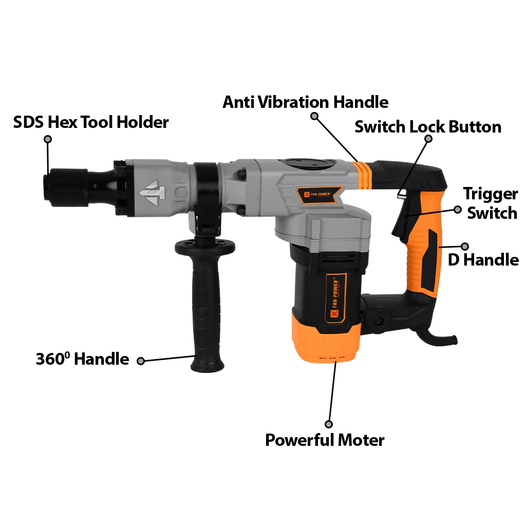 Buy the perfect tool for heavy-duty demolition projects and level up your professional skills Xtra-power Demolition Hammer has a sustainable design with high-quality materials to render the best performance under any circumstances. It has a hammer and impact mechanism to easily get into hard surfaces and make holes by striking from front to back. The tool is adept at handling heavy-duty operations such as tearing down concrete, breaking brick walls etc. The 1300 Watts motor with an SDS hex tool holder maximises the heavy-duty demolition and chiselling work. Crafted with an anti-vibration handle, it prevents users from getting injured during work. The dust-proof switch and high-strength cylinder reduce the pushing pressure to smooth the drilling effort. The variable speed switch allows the operator to adjust the speed of the machine according to the project's requirements. The Demolition Hammer requires less maintenance and promises a long life span.