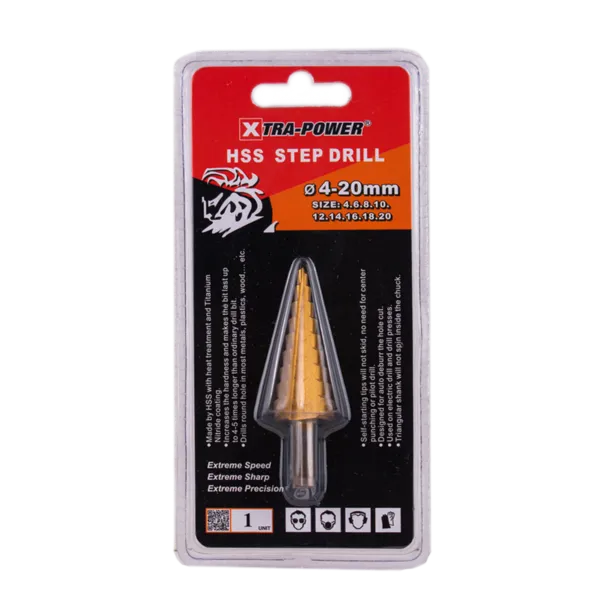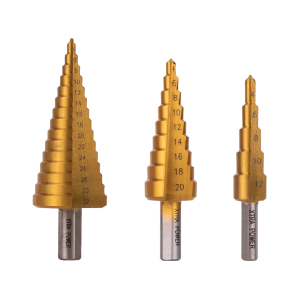 looking for a tool that does not skid or demands punching and pilot drill? Xtra Power introduces the HSS Step Drill bit, made of high-speed steel with heat treatment and a thick Titanium Nitride coating for automatic hole-cut deburring. The bit’s construction technique increases its hardness and extends its life lifetime by 4-5 times that of a standard drill bit. This incredible tool can drill deeper holes in metals, wood, polymers, and other materials. It is cleverly designed to avoid a skid, center punching, and pilot drilling, saving time and effort. It has a triangular shank that does not spin inside the chuck, making it extremely controllable and time-saving.