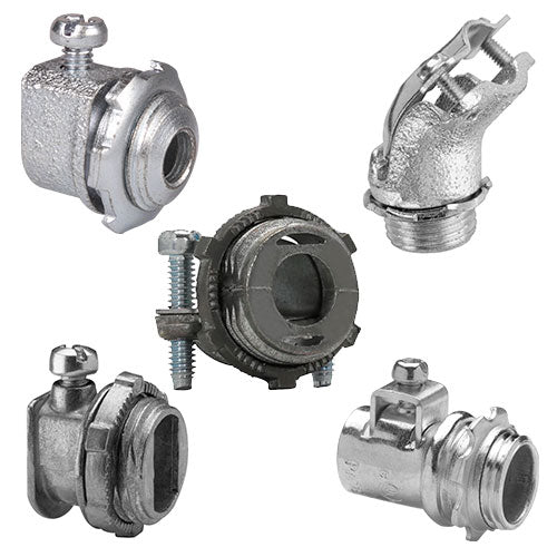 Crouse-Hinds series AC/MC connectors and couplings are used to connect armored cable, metal-clad cable or flexible metallic conduit to a box or enclosure. Our AC/MC fittings are available in set screw, clamp and saddle grip styles. They are available in steel, malleable iron and zinc die cast.