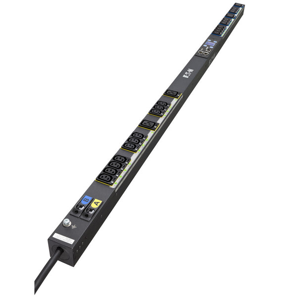 Eaton Switched Rack PDU models allow lights-out control of devices including switching devices powered across multiple ePDUs. They include IEC Class 1 (1%) billing grade accuracy, an advanced hot-swap meter with LCD pixel display showing V, W, A and kWh, and the ability to daisy chain 8 ePDUs to share the same network connection and IP address.