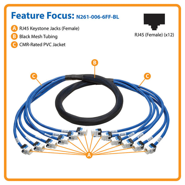 Eaton Tripp Lite series Cat6a 10G Pre-Terminated Copper Trunk Assembly (6x RJ45 F/F), Blue, 10 ft. (3.05 m)
