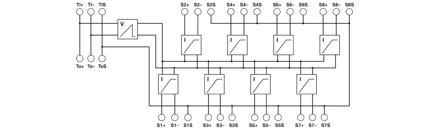 Device coupler for Foundation Fieldbus and PROFIBUS PA with terminal connections for eight spurs connected to fieldbus end devices.