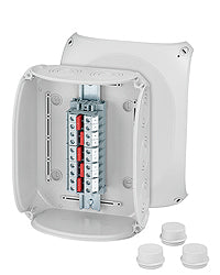 - 5-pole per polel 4 x 6 mm² sol/f, 4 x 10 mm² sol/f, 4 x 16 mm² sol/s/f, conductors are inserted into the screw-type terminal, terminal technology, see annex DK Cable junction boxes