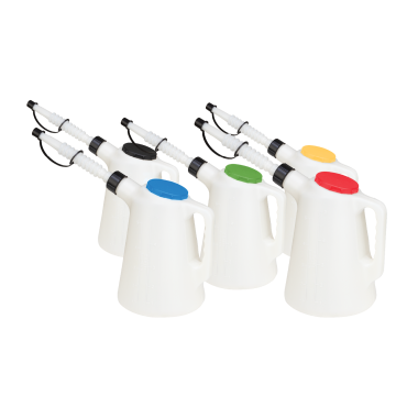 The Groz Professional Spout Measures are designed with a colour coded system to streamline multiple fluid transfer and prevent lubricant contamination and mix-ups. Manufactured from high-density polyethylene, these measures are sturdy and durable for long-lasting use. The flexible spout allows for easy pouring and controlled dispensing of fluids. The set includes differently coloured lids - Blue, Red, Yellow, Green, and Black which allow easy differentiation between various fluids and lubricants.