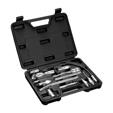 The Groz 11 Pc Standard Greasing Accessory Kit is designed for use in garages, workshops, construction sites, agriculture, and marine applications. With a versatile set of professional-grade attachments that fit most grease guns, hydraulic couplers, grease pumps, and dispensing equipment, you're equipped for precision greasing in various industries. For added convenience, all components are neatly organized in a heavy-duty, easy-to-carry case. The kit constituents of 4” Needle Nose Adaptor, 1-1/2” Narrow Needle Nose Dispenser, 19/32” Needle Nose Dispenser, 90 degree hydraulic coupler, 1-1/2” x 18 gauge grease injector needle, Seal off dispenser, 4 Jaw standard hydraulic coupler, 360 degree Slim line swivel coupler, 4” Steel extension, 6” steel extension and 14” Grease hose.