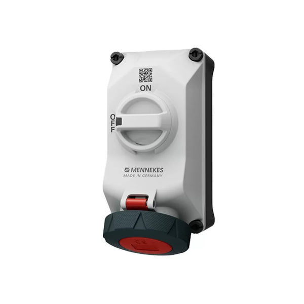 The MENNEKES 5604506G is a durable wall-mounted fused receptacle designed for safe electrical connections. Featuring a switched mechanism with mechanical DUO-Interlock, it ensures reliable operation at DUO-Interlock 32Amp 3+N+E Poles IP 67 for protection against dust and water ingress. Perfect for industrial applications.