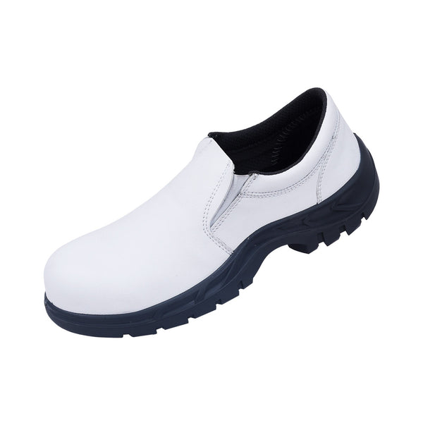 - Safety footwear type ABAWRF in white micro fiber din leather with a protective composite toe and soft grey lining. The safety shoe is a water repellent slip on style protection shoe with a single density PU sole.
