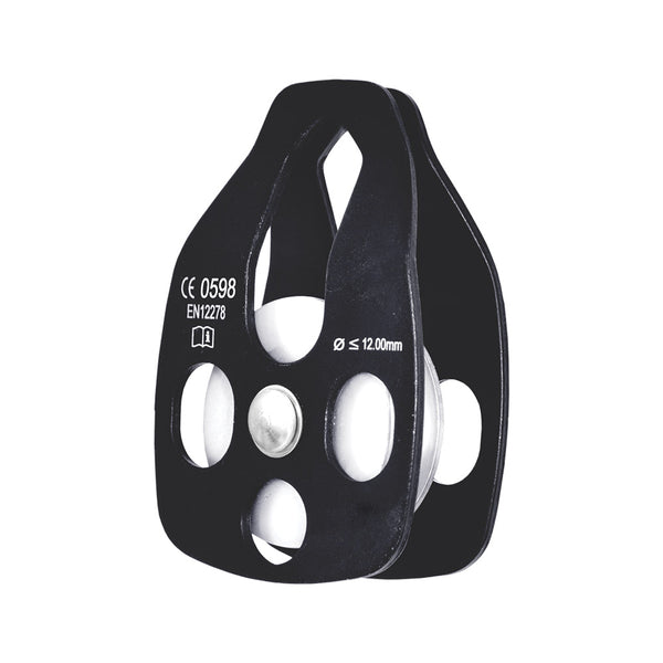 A single aluminium anchorage pulley on a ball bearing is a lightweight and durable pulley system used in anchorage applications. The aluminium construction provides strength while keeping the weight low, and the ball bearing ensures smooth rotation, minimizing friction. It is commonly utilized in activities like rock climbing and rope access for safe and efficient movement along ropes or cables. The pulley has attachment points for secure mounting to an anchoring structure, such as an anchor point or harness. This configuration allows for reliable and stable movement, making it an essential component in safety systems that require smooth operation and dependable anchorage.