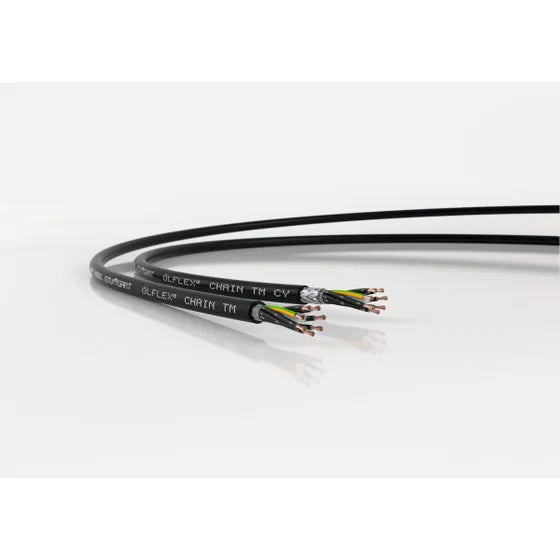 ÖLFLEX® CHAIN TM CY 7G18AWG is a high-performance, shielded power and control cable designed for dynamic applications, such as robotics, automated systems, and industrial machinery. Featuring seven 18 AWG conductors, this cable is ideal for applications that require multiple connections in continuous motion environments. The shield (CY) provides protection against electromagnetic interference (EMI), ensuring stable signal transmission. It offers excellent resistance to mechanical stress, abrasion, oils, and chemicals, making it highly durable and reliable in harsh industrial conditions, energy chains, and moving applications.