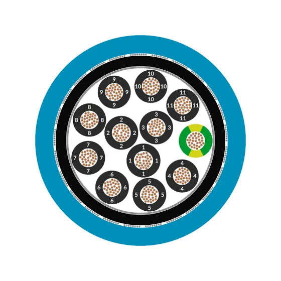 The ÖLFLEX® PETRO C HFFR 7G1,5 BU is a heavy-duty, oil-resistant control cable specifically designed for use in demanding environments, particularly in petrochemical and offshore industries. It features 7 fine-stranded copper conductors, each with a 1.5 mm² cross-section, ensuring reliable power and signal transmission. The cable is equipped with a High-Fire-Performance Low-Smoke (HFFR) outer sheath that provides excellent resistance to oils, chemicals, and abrasion, while also offering enhanced fire safety. Ideal for installations in harsh environments, it combines flexibility, durability, and safety. The blue (BU) sheath color further indicates its suitability for industrial and safety-critical applications.