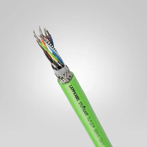 The ÖLFLEX® SERVO 728 CY 4x(2x0,14)+(2x1,0) is a highly flexible servo cable designed for use in industrial automation and motion control systems. It consists of four sets of 2 cores of 0.14 mm² for signal transmission and two additional cores of 1.0 mm² for power. The cable is shielded to minimize electromagnetic interference, ensuring reliable and precise data transfer in demanding environments. Its durable construction makes it ideal for high-performance applications requiring flexibility and consistent performance.