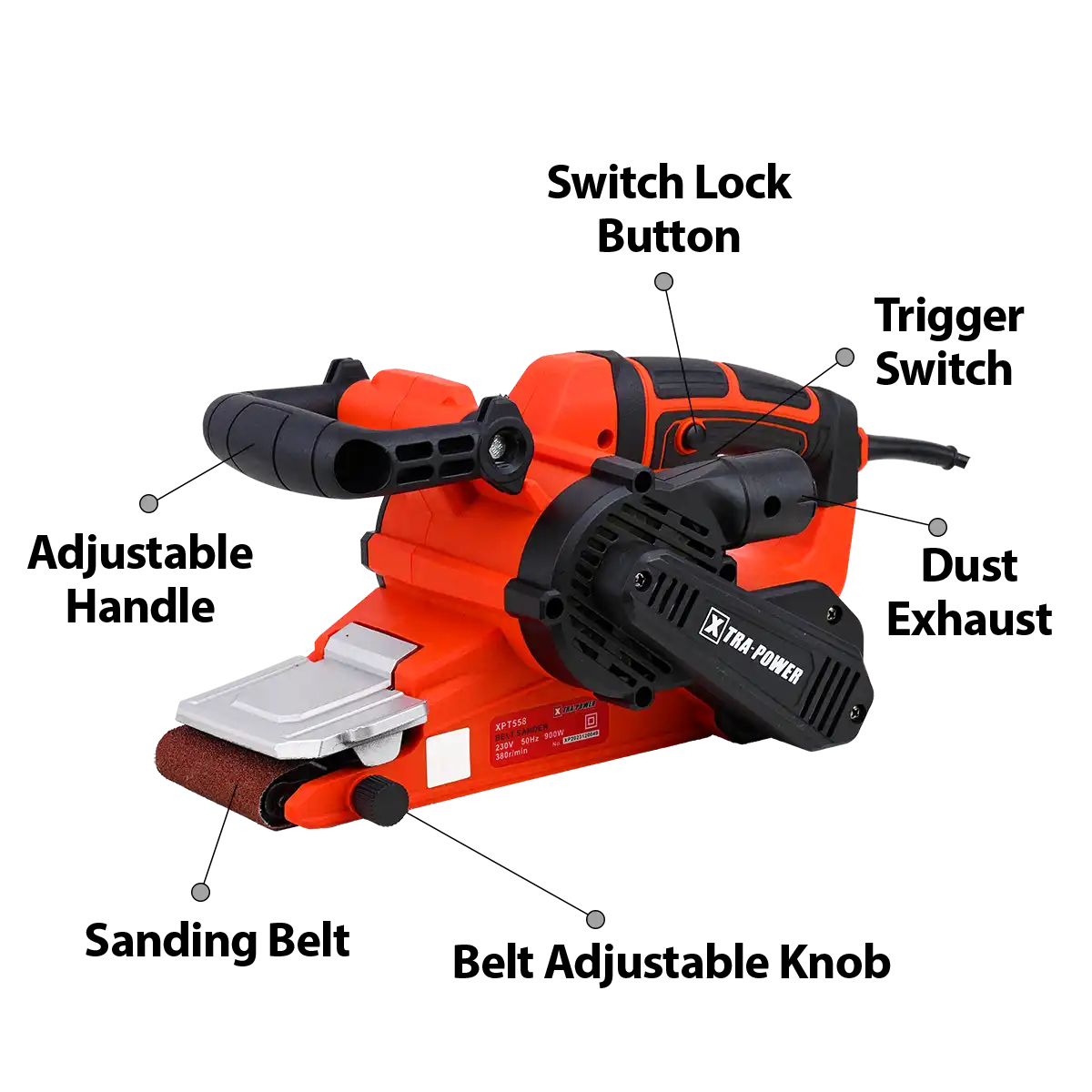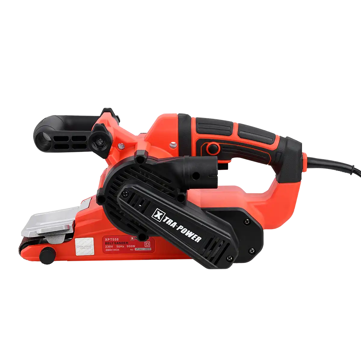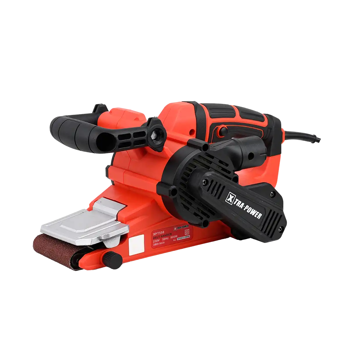 The XPT 558 Belt Sander is designed to achieve smooth finishes on various surfaces, featuring a no-load speed of 380 RPM for efficient work without quality compromise. This belt sander has a belt size of 76 x 533 mm, suitable for different sanding tasks, from large surfaces to detailed work. It is powered by a 900-watt motor, delivering ample power for demanding applications. The tool's balanced weight distribution reduces fatigue during prolonged use, while its compact and ergonomic design enhances maneuverability for precise sanding results. Equipped with a quick belt change system, dust extraction feature, and variable speed control, the XPT 558 is built for reliability, power, and a superior finish, making it an essential tool for refinishing floors, preparing surfaces for painting, or working on custom furniture projects.