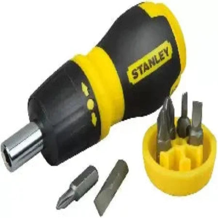 The Stanley Multibit Stubby Screwdriver is a compact and versatile tool designed to handle various screwdriving tasks with ease. Crafted with precision engineering and high-quality materials, this screwdriver exemplifies the durability and innovation that Stanley is known for in the realm of hand tools. At its core, the Stanley Multibit Stubby Screwdriver features a stubby design that allows for easy maneuverability in tight spaces and awkward angles. Despite its compact size, this screwdriver packs a punch with its interchangeable bits, offering versatility for different screw types and sizes commonly found in household and professional applications. Versatility is a key characteristic of the Stanley Multibit Stubby Screwdriver. With its interchangeable bits, including Phillips, slotted, and Torx, this screwdriver provides the flexibility to tackle a variety of screwdriving tasks without the need for multiple tools. The magnetic bit holder securely holds the bits in place during use, preventing them from slipping or falling out, while the quick-change mechanism allows for effortless swapping of bits, saving time and effort on the job. Durability is a hallmark of Stanley tools, and the Multibit Stubby Screwdriver is no exception. Constructed from high-quality materials such as hardened steel and durable plastics, this screwdriver is built to withstand the rigors of daily use in demanding work environments. The robust construction ensures longevity, making it a trusted companion for professionals and enthusiasts alike. Portability is another key feature of the Stanley Multibit Stubby Screwdriver. Its compact size and lightweight design make it easy to carry in a toolbox, pocket, or belt pouch, ensuring that you always have the right tool for the job within reach. Whether you're working on a job site, performing household repairs, or tackling DIY projects, this screwdriver is a convenient and practical addition to your toolkit. In summary, the Stanley Multibit Stubby Screwdriver is an indispensable tool for professionals and enthusiasts seeking versatility, durability, and convenience in their screwdriving tasks. With its compact design, interchangeable bits, durable construction, and portability features, this screwdriver sets the standard for excellence in the world of screwdriving tools.