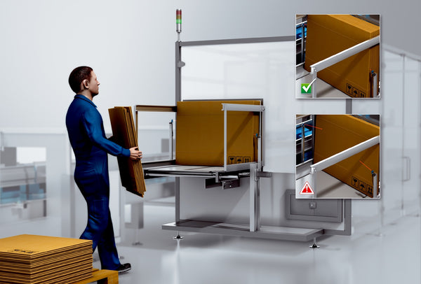 Increase the safety and productivity of packaging machines with the modular Safeguard Detector safety system. The Safeguard Detector consists of two MultiPulse photoelectric proximity sensors, and the Flexi Soft safety controller or the UE410-SD evaluation module. The Safeguard Detector safely detects whether a movable physical guard is located at a previously defined position, e.g., the packaging material in the carton magazine of packaging machines. If there is sufficient packaging in the carton magazine, then it is not possible to reach into the hazardous area while the machine is running.