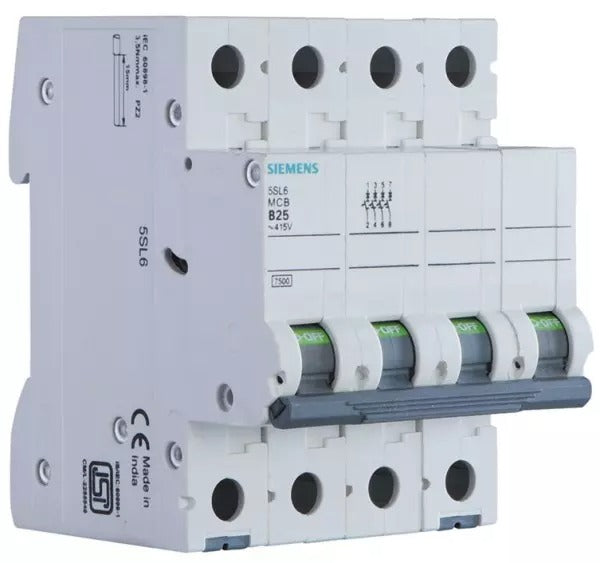 The Siemens 5SL64206RC-20A is a 20A, 4-Pole Miniature Circuit Breaker (MCB) designed for reliable overcurrent protection in three-phase electrical systems. With a 7.5kA breaking capacity and Type B characteristics, it provides effective protection against overloads and short circuits, particularly in circuits with low inrush currents. Rated for 240/415V AC at 50-60Hz, this MCB is ideal for residential and light commercial applications, ensuring long-lasting safety and operational reliability.