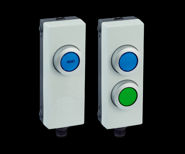 Reset pushbuttons and multiple pushbuttons from the ER12 product family are used wherever a function must be activated manually. The different product types are suitable for a wide range of applications. A reset pushbutton resets a protective device if a machine restart is required after a previously initiated stop function. A multiple pushbutton in the dual pushbutton version is used in applications in which two pushbuttons are needed. The flexible options for use of the two pushbuttons are advantageous here - both the reset function as well as other functions can be operated using one operating unit.