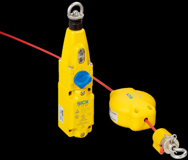 The i110RP rope pull switches ensure that dangerous movements are reliably stopped over distances up to 30 m. The rope is connected to the rope pull switch for optimum safeguarding of hazardous points that are not protected by safety covers, e.g., conveyors. In the working position, the rope is under tension and the safety-relevant contacts – the positive opening normally closed contacts – are closed. The contacts are opened by a pull on the rope or if the rope breaks, the emergency stop function is triggered. Actuation is possible at any point along the rope.