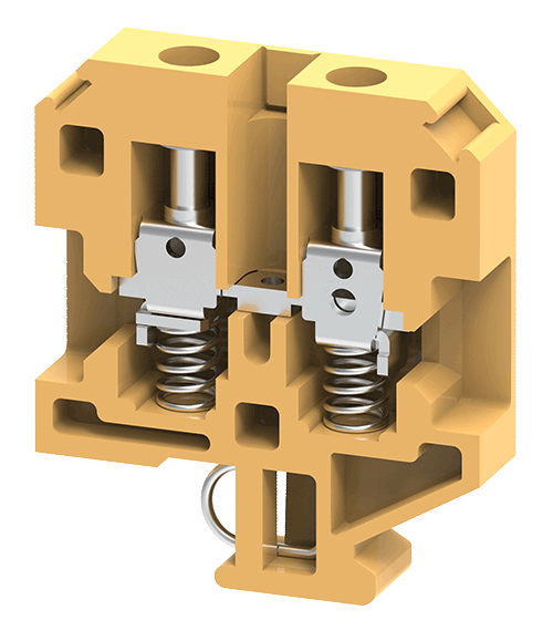 These modified version of feed through Terminal Blocks come with safety springs. These Terminal Blocks are preferred for connections that involve safety requirements of the Electric Supply Industry (ESI) standards, British CEGB regulations and NTPC applications. In addition to the high torque screws, these blocks have a built-in spring loading feature. It is recommended to use hook type lugs for terminating wires in such connections. These Terminal Blocks have a specially designed current bar for the right location/ placement of wires with hook type lugs, thus preventing loosening of the wires even when the screw clamps are not tightened.