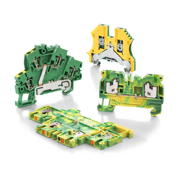 PE protective earth terminal blocks in green-yellow, PE terminal blocks, ground terminal blocks with PEN function, earth-wire disconnect terminal block or earth disconnect terminal blocks for the DIN rail
