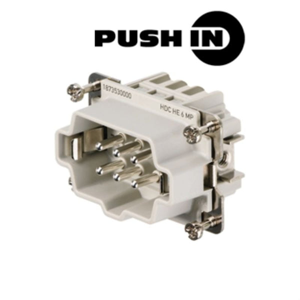 The HDC HE 6 MP is a compact heavy-duty connector with 6 poles, designed for industrial applications. Its robust construction ensures reliable electrical connections for power and signals, ideal for demanding environments. The connector offers secure and durable performance, making it suitable for automation and electrical systems.