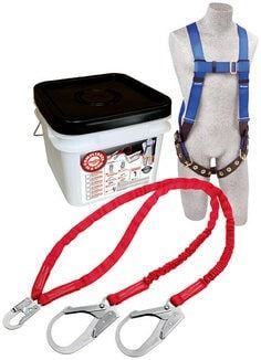 All purpose fall protection kit includes AB17550 FIRST™ harness, 1340250 PRO-Stop™ 6 ft. (1.8m) double-leg shock absorbing lanyard and bucket.