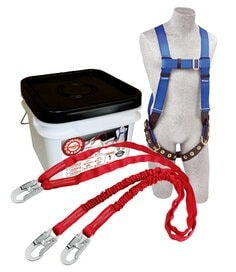 All purpose fall protection kit includes AB17550 FIRST™ harness, 1340240 PRO-Stop™ 6 ft. (1.8m) double-leg shock absorbing lanyard and bucket.