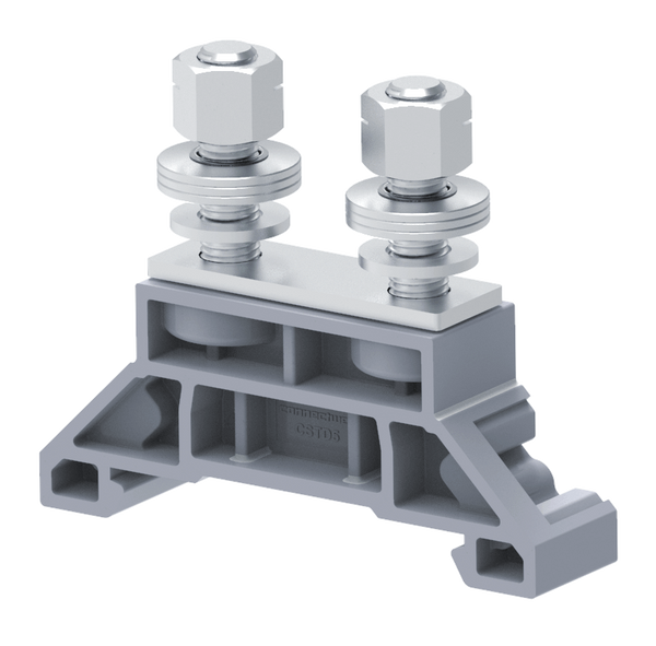 | These Terminal Blocks are preferred for applications where the connections are subjected to severe vibrations. The wire is crimped to ring type Lug and connected to the Stud Terminal Block. The CSTD5E16 Terminal Blocks suitable for wire sizes from 2.5 to 16 sq.mm. The self locking nut can then be fastened to complete the connection. |
