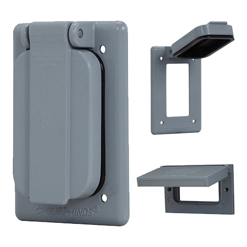 Crouse-Hinds series WLRS, WLRD and WLGF wiring device covers are designed to meet NEC Code requirements for wet and damp locations. They are suitable for use in industrial, commercial and residential areas as a general purpose utility receptacle cover or wherever portable equipment is required. The covers mount to Crouse-Hinds series FS and FD single-gang or multi-gang boxes with individual cover openings.