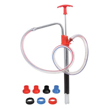 The Groz Standard Duty Ezee Flow Pump is designed for use on 20-25 litre / 5-gallon containers with plastic pull out (Rieke spout) or 2” external threads. This downstroke operated pump ensures smooth discharge, reducing fatigue and stress. Its polyethylene pump head includes a nozzle holder and drain-back option while the heavy-duty steel suction tube allows for extension by over 4" (100mm). With interchangeable bung adaptors for various container types, it comes complete with a steel discharge spout, 48" non-kink hose, and non-drip feature. Recommended for Engine Oils, Gear Oils, Diesel, Light Fuel Oil, Antifreeze, and Glycerine. It delivers upto 1 litre (1 quart)/18 strokes, guaranteeing efficient and reliable performance.