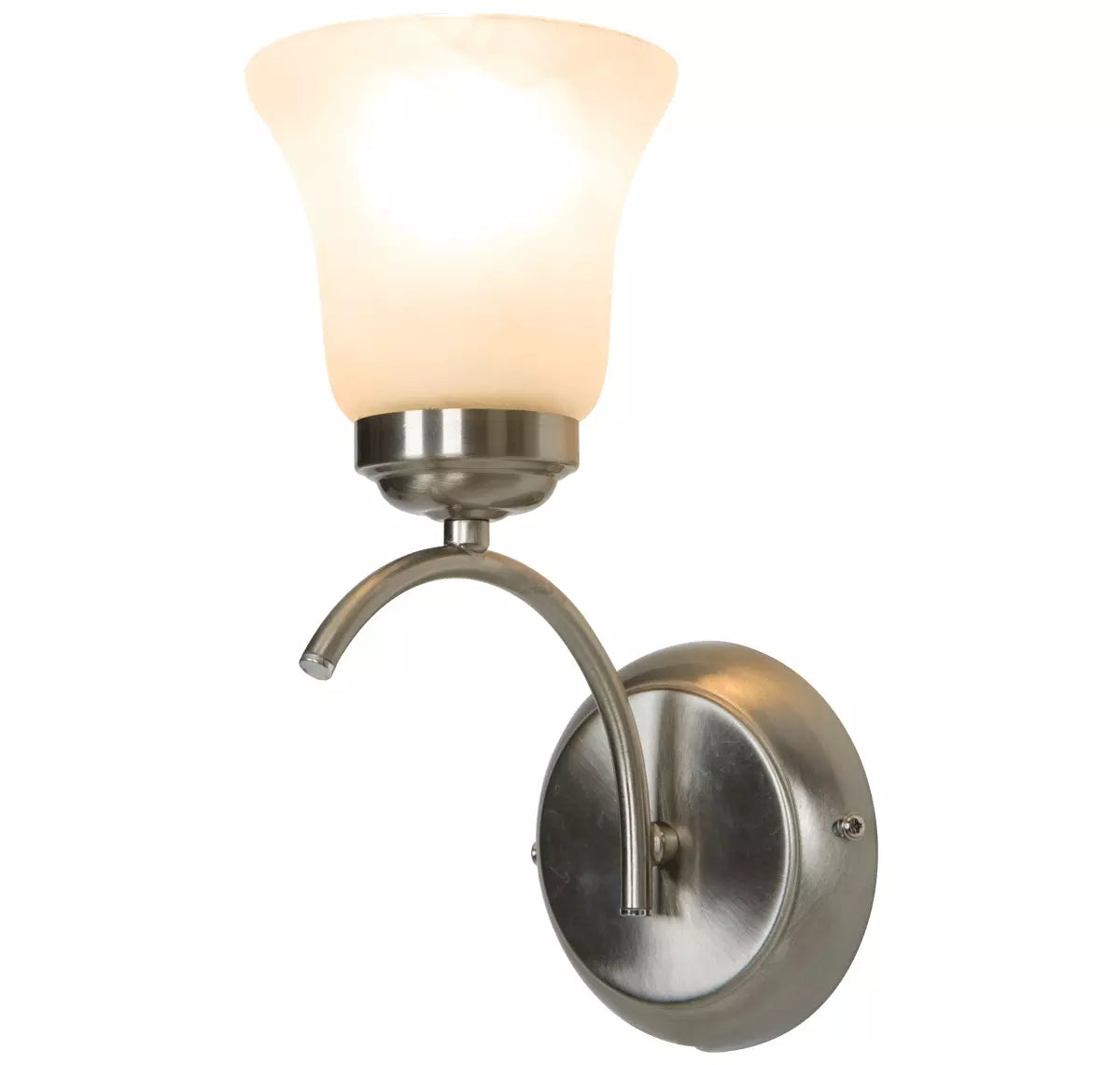 Decorative, wall mounting, brushed nickle finish fixture with opal glass diffuser suitable for 4 W LED filament lamp E14 base.