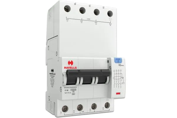 RCBO 'A' Type TPN 4M is a residual current circuit breaker with overload protection designed for three-phase, neutral (TPN) systems. The 'A' type provides protection against both alternating (AC) and pulsating DC residual currents, making it suitable for systems with electronic or variable frequency drives. The "4M" refers to the device's 4-module width, which fits standard distribution boards. It ensures safety against electric shocks, leakage currents, and overloads, ideal for industrial and commercial applications with high electrical demands.