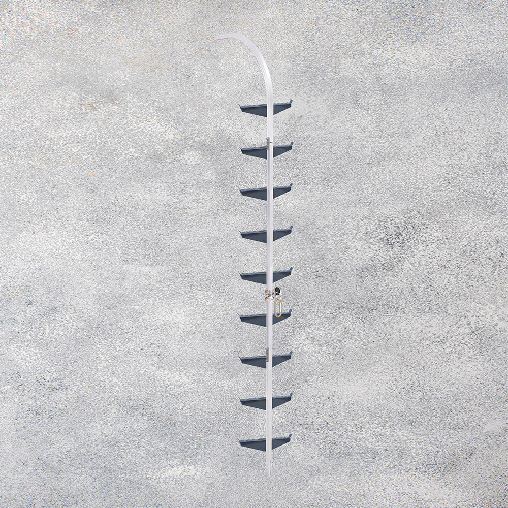 Steel ladder rungs (black) over which the vertical anchorage rail made of anodized aluminium is fixed.