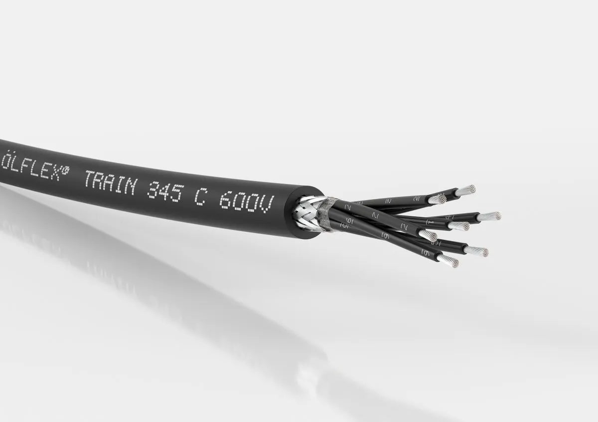The ÖLFLEX® TRAIN 345 C 600V 12x0,75 is a highly flexible, multi-core control and connection cable designed for demanding railway applications. It features twelve 0.75 mm² conductors and is rated for 600V, ensuring reliable power and signal transmission. The cable is resistant to oil, abrasion, and mechanical stress, providing long-lasting durability and performance. Ideal for use in trains and transportation systems, it offers secure, efficient electrical connections, making it suitable for environments that require multiple small conductors for signal and control systems in complex installations.