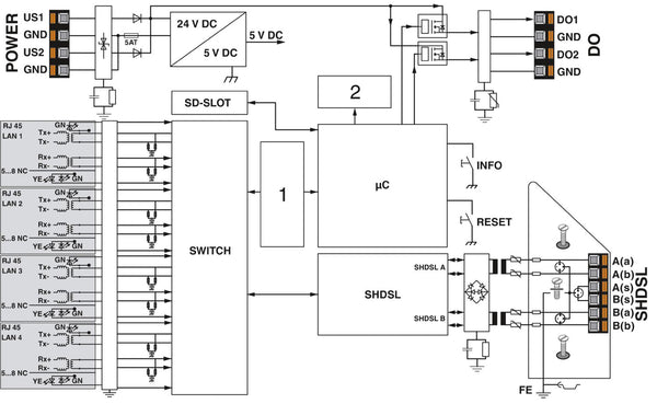 Managed Ethernet extender, point-to-point, line and ring structures, data rates up to 30 Mbps, distances of up to 20 km on in-house copper cables, replaceable surge protection, 2 SHDSL ports, 4-port switch, diagnostics via display and Ethernet