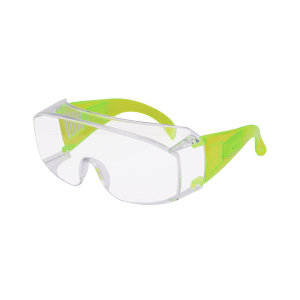 - Frameless safety over spectacles with impact resistant Polycarbonate clear coated lens with integrated side shields, where the user wears prescription glasses.