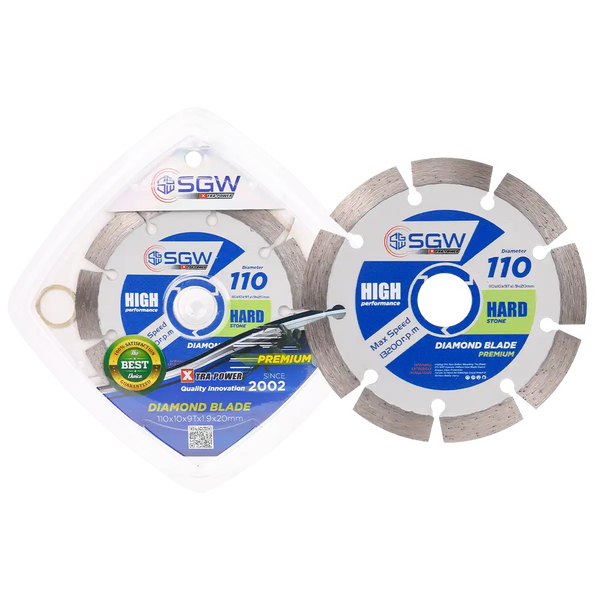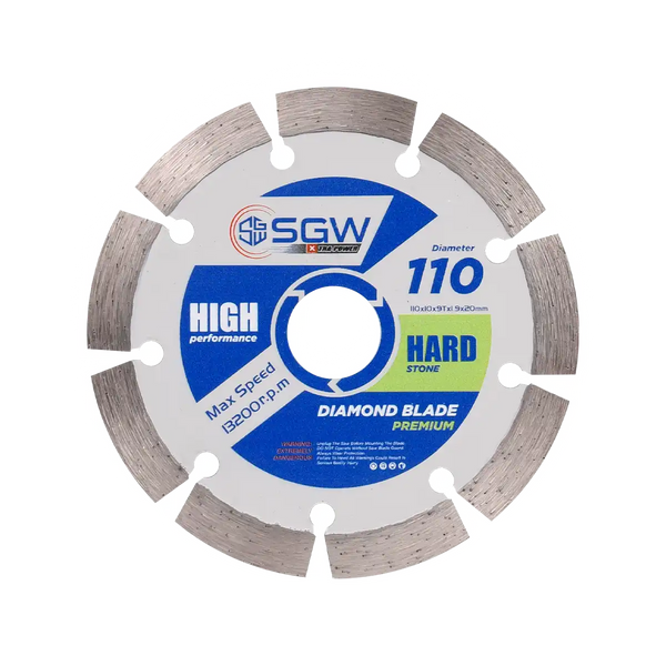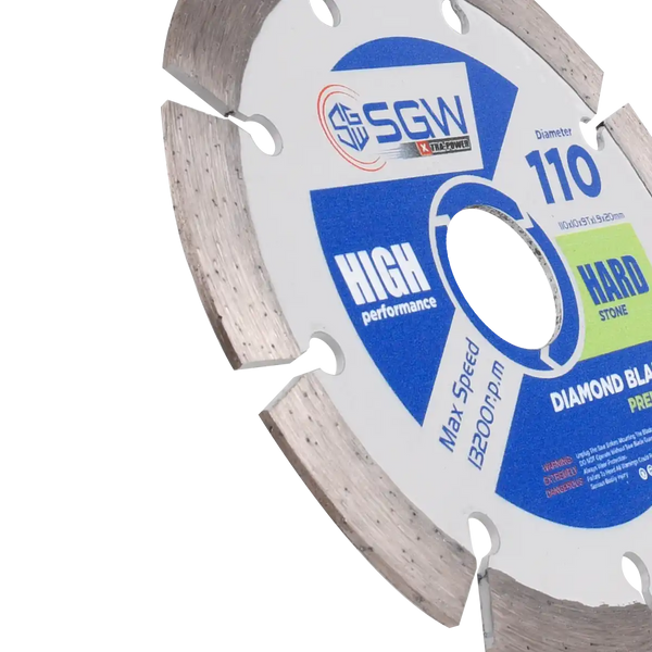 The SGW HARD STONE Diamond Saw Blade is a cutting-edge tool engineered to excel in precision and durability when tackling the toughest hard stone materials. These diamonds saw blade are known for their exceptional hardness and ability to withstand the most demanding cutting tasks.The 10-segment design ensures a consistent and smooth cutting performance. Each segment is strategically positioned to optimize cutting efficiency and minimize wear and tear.The blade's steel core is engineered to withstand the rigors of heavy-duty cutting. It provides stability and precision, ensuring that your cuts are accurate and clean. The 110mm, 20.00mm, 10-segment blade is also highly effective in cutting through concrete.
