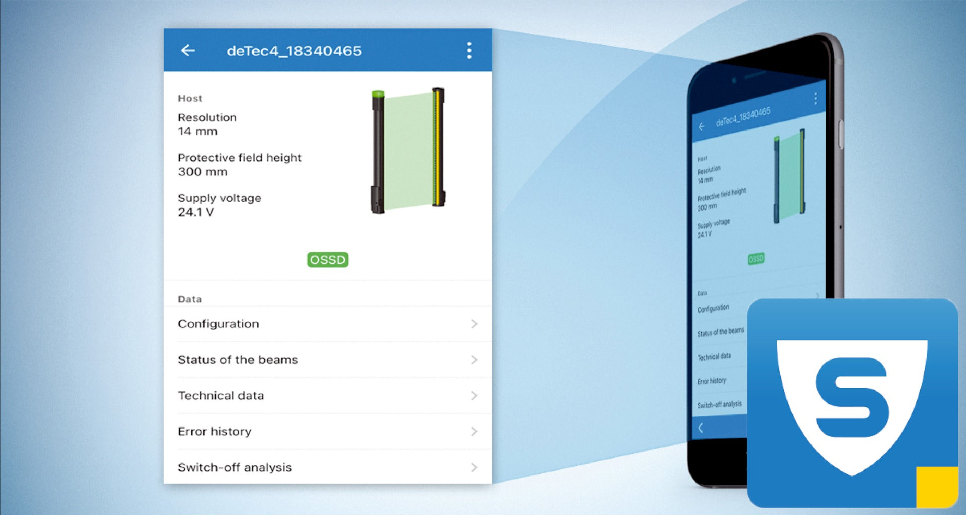 The SICK Safety Assistant app enables comprehensive condition diagnostics of your safety sensors easily on site, even if the sensor has no supply voltage. Position your smartphone or tablet with the installed app at the NFC logo of the sensor and quickly get an overview of technical data, the status of the beams, the error history, and detailed shutdown analysis. The app also helps configure your sensors. With the SICK Safety Assistant, you have all your information at hand at any time.