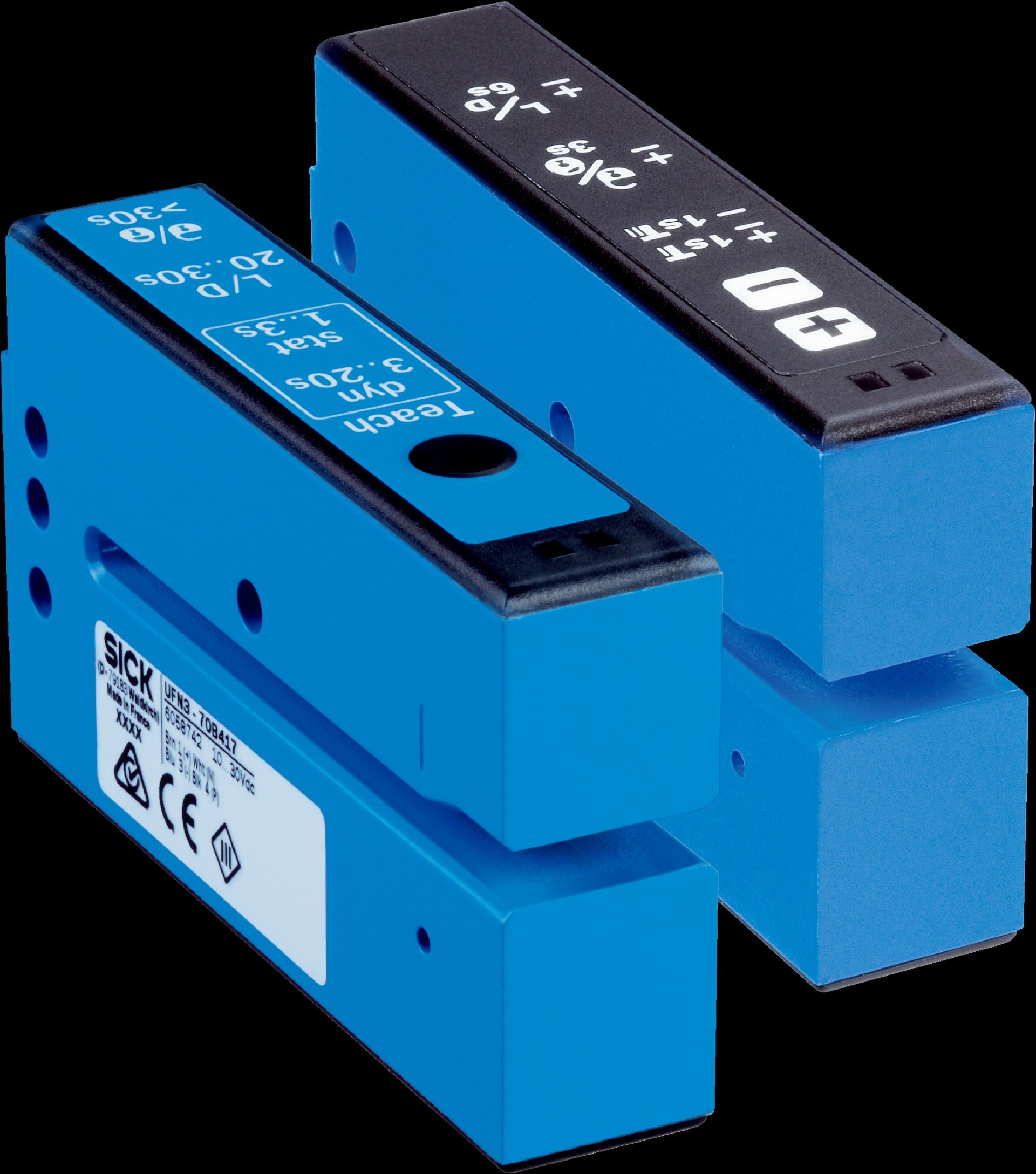The UF ultrasonic sensors reliably detects labels and materials, regardless of printed design, transparency or surface characteristics. Unlike optical sensors, the UF3 relies on damping – a process where the thickness of a material determines the degree to which the sensor absorbs sound waves. A high level of positioning accuracy and stable response times make the fork sensor suitable for nearly any environment. Due to its small, compact metal housing, the UF can be used in harsh conditions and where space is limited. As a result, the UF3 can distinguish between labels located just 2 mm apart from one another on an adhesive tape. Applications include detecting transparent labels on transparent substrates, detecting labels with different printed designs or differentiating between single- and two-ply materials.