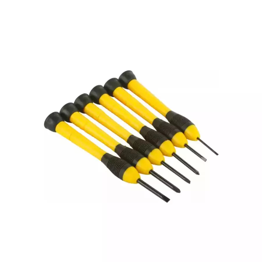 The Stanley Precision Screw Driver Set is a classic screwdriver set that comes with 6 different sized flat & Phillips head screwdrivers, making it ideal for home and professional use. Made from high-quality chrome vanadium steel, the handles are designed for comfort and long lasting use. The hardware tools feature strong magnetic tips, allowing it to hold small parts while working. Flat blade model has a flat blade and can be used for most general fastening and removal jobs. This is a great set for all light to medium duty applications, where one needs high precision and quality tools. Precision-milled screwdriver shafts maintain close tolerances for better surface contact and faster driving speeds. Textured grips offer improved comfort & increased torque output. Skid-proof hex shanks prevent slipping from any angle while ensuring a firm grip on screws while they are being inserted or removed.