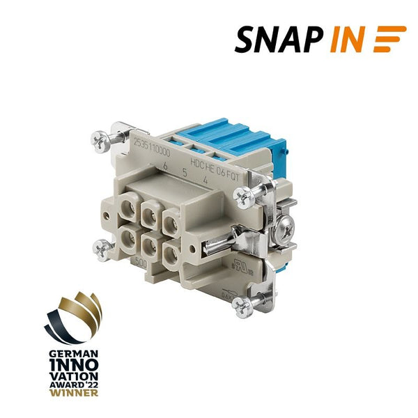 The HDC HE 06 N FQT BL is a heavy-duty rectangular connector with 6 poles, designed for industrial use. It features a blue (BL) housing for easy identification. Built for durability, it ensures reliable power and signal connections, offering secure and efficient performance in demanding environments.