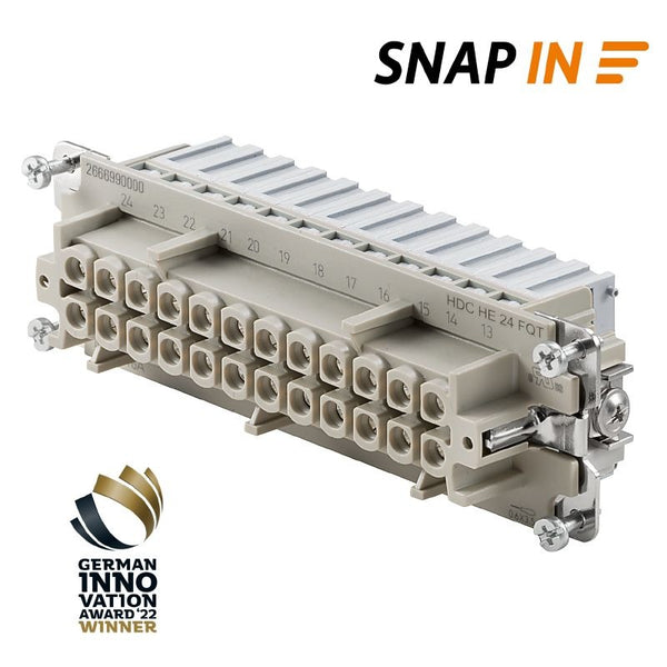 The HDC HE 24 N FQT is a robust heavy-duty connector designed for industrial applications. It features 24 poles, providing high-capacity connectivity for power and signals. Engineered for durability, it supports reliable operation in demanding environments. Its design ensures secure and efficient electrical connections for a wide range of applications.
