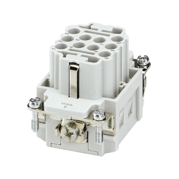 The HDC HEE 10 FP is a heavy-duty connector with 10 poles, designed for industrial environments. It provides reliable power and signal connections, ensuring secure and efficient performance. With its robust construction, it is built to endure demanding conditions, making it ideal for use in automation, control systems, and other industrial applications.