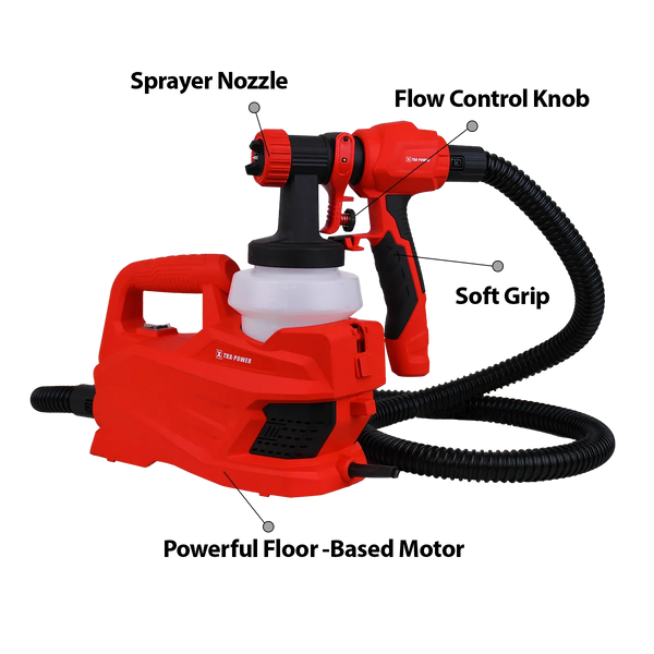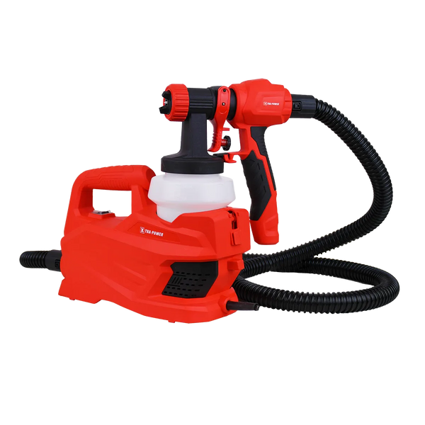 XPT-522 Floor Base Spray Gun from Xtra Power, designed for efficient and high-quality painting. With an 800W motor, it handles up to 100 Din-seconds of viscosity, ensuring smooth application. The 0.8-litre tank and 1.1L/min paint flow rate allow for extended use. Featuring High Volume Low Pressure (HVLP) technology, it provides excellent paint atomization with adjustable painting patterns and flow rates. The spray gun includes three different diameter nozzles for various uses, making it perfect for both professional and DIY projects.