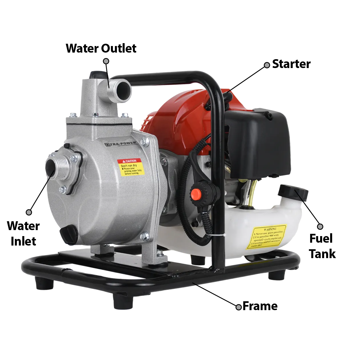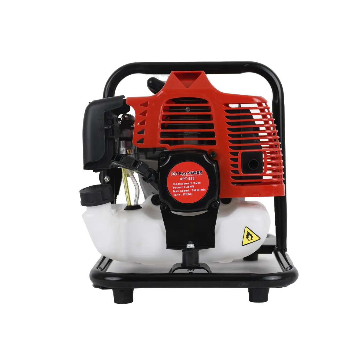 XPT 583 Water Pump: a powerhouse of performance and innovation designed to meet the diverse water management needs across residential and industrial domains. With a robust input power of 1.45 kW and a 2-stroke displacement of 52 CC, this pump effortlessly tackles a variety of tasks. Its efficient 01:25 mixing ratio optimizes fuel consumption, while the 1.2 L fuel tank capacity ensures extended operation. Operating at a no-load speed of 7500±500 RPM, the XPT 583 exhibits reliable power delivery. The pump's versatility shines through its 1-inch inlet and outlet sizes, enabling seamless connections. Boasting an impressive max flow rate of 7 M³/H and a max total head of 24 M, it excels in transferring water with efficiency and precision. Moreover, with a max suction lift of 7-9 M, this pump proves its reliability even in challenging conditions. Whether it's water transport or cleanup, the XPT 583 Water Pump stands as your dependable solution, making water management tasks a breeze while ensuring durability and top-tier performance.